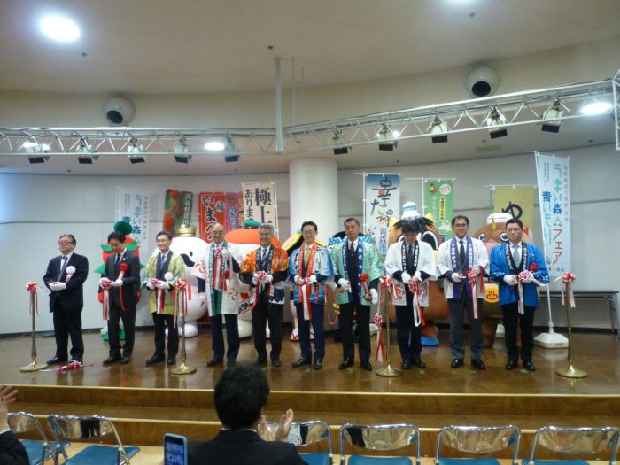 オープニングセレモニーが始まり、参加市町村長がテープカットを行い、フェアが開幕しました。