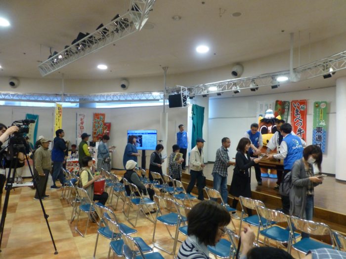 風間浦村からは、冨岡村長と風間浦村のマスコットキャラクター「あんきもん」が登場し、冨岡村長と海産物詰め合わせセットをかけ、ジャンケン大会を行ったところ、大変盛り上がりました。